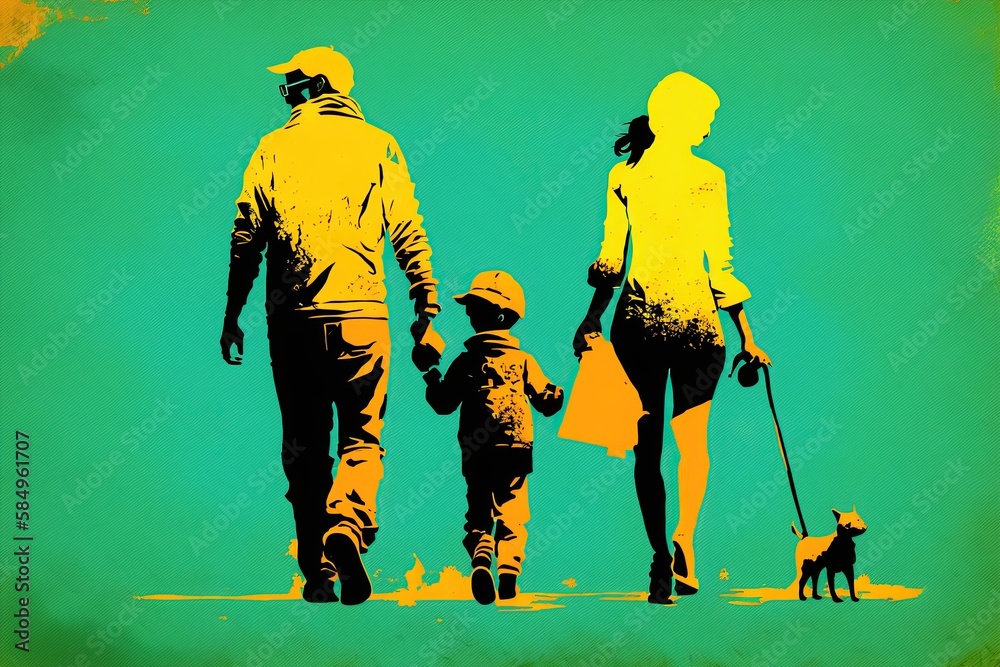 yellow/ green/ orange pictogram of family walking holding hands #584961707