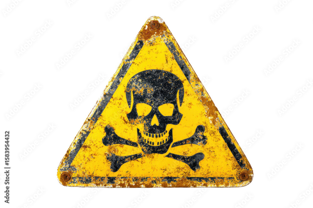 Yellow triangular sign. Grungy style danger sign with skull and cross bones. Rusty. Warning. Caution. Hazard. Danger. Worn out on white background #1583954432