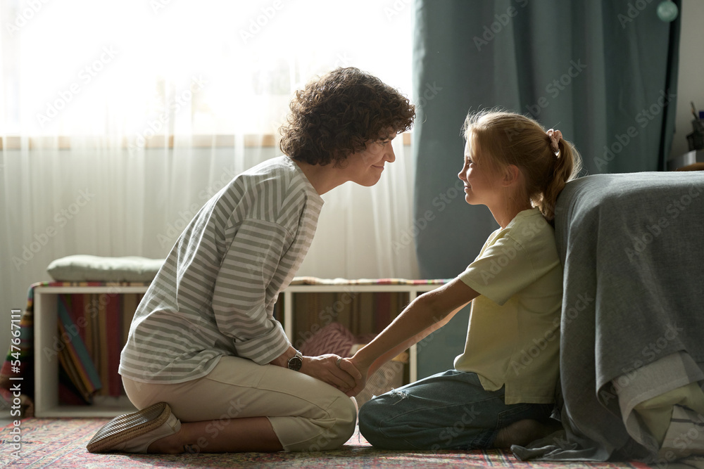Young mother playing with her little daughter during her leisure time, they sitting on floor in bedroom and smiling to each other #547667111
