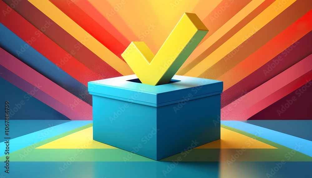 A colorful ballot box featuring a large check mark symbolizes voting and civic engagement. #1067884759