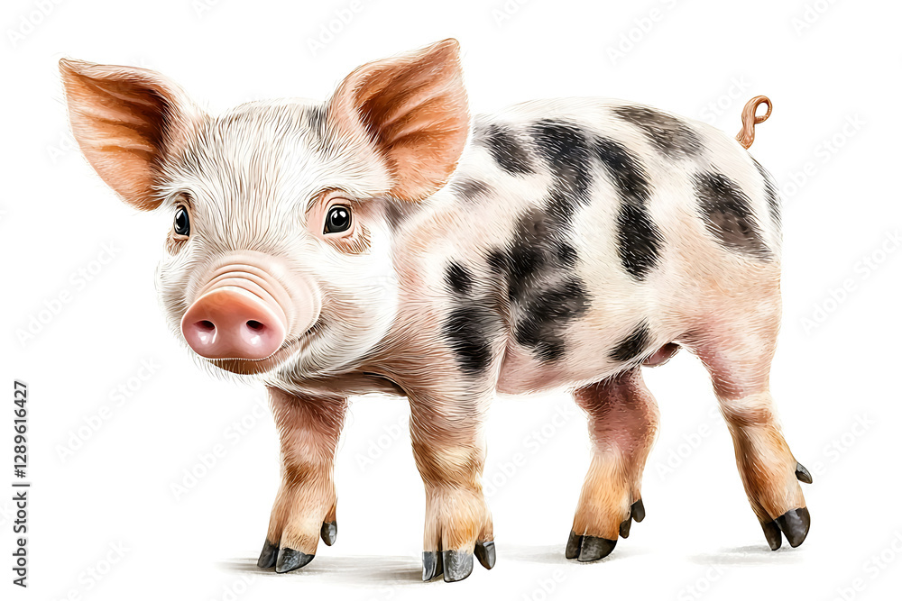 A cute spotted piglet with floppy ears and a curly tail stands against a plain white background. #1289616427