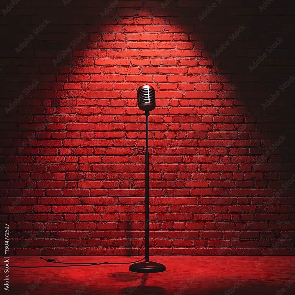 A minimalist comedy club poster background, featuring a lone microphone in front of a red curtaindraped brick stage, spotlight casting long shadows, sleek design, ultraHD 8K #1304772527