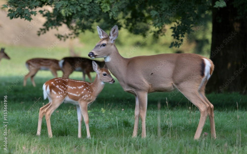 A mother and fawn European roe deer grazing in a green meadow with tall grass and wildflowers, with a soft, warm hue in the background #1153661916