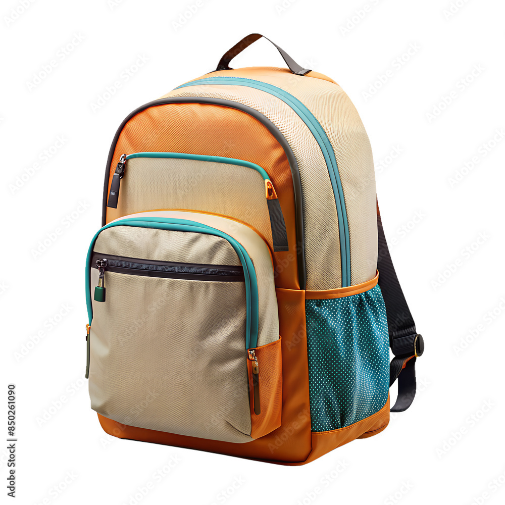 A multi-colored backpack with a blue strap isolated on transparent background png. #850261090