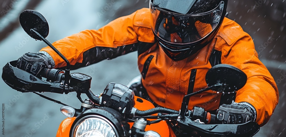 A person in an orange jacket and black helmet riding a motorcycle on a rainy day, close-up view, with an orange-colored background, #1079742288