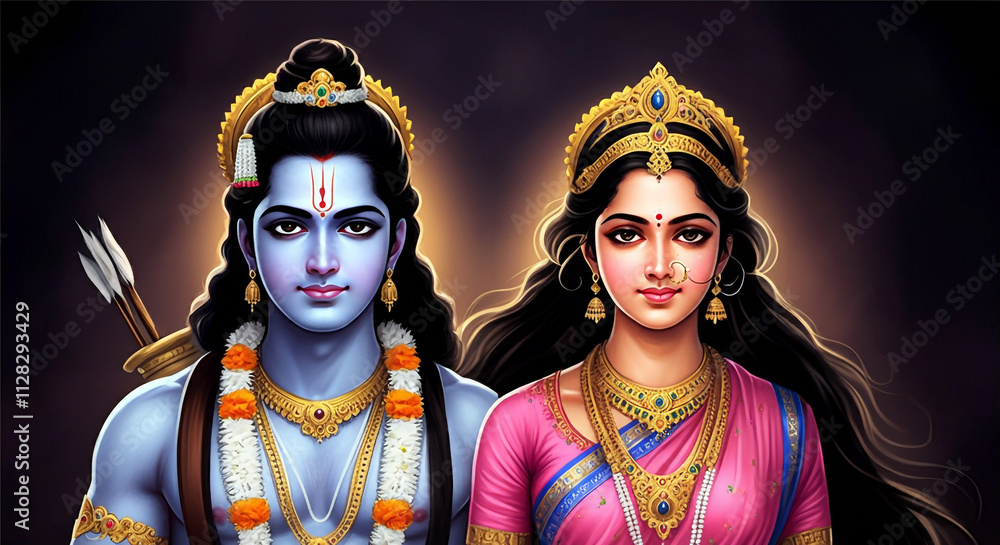 A radiant portrayal of Lord Rama, Sita, and Lakshmana, embodying unity, devotion, and the journey of righteousness #1128293429