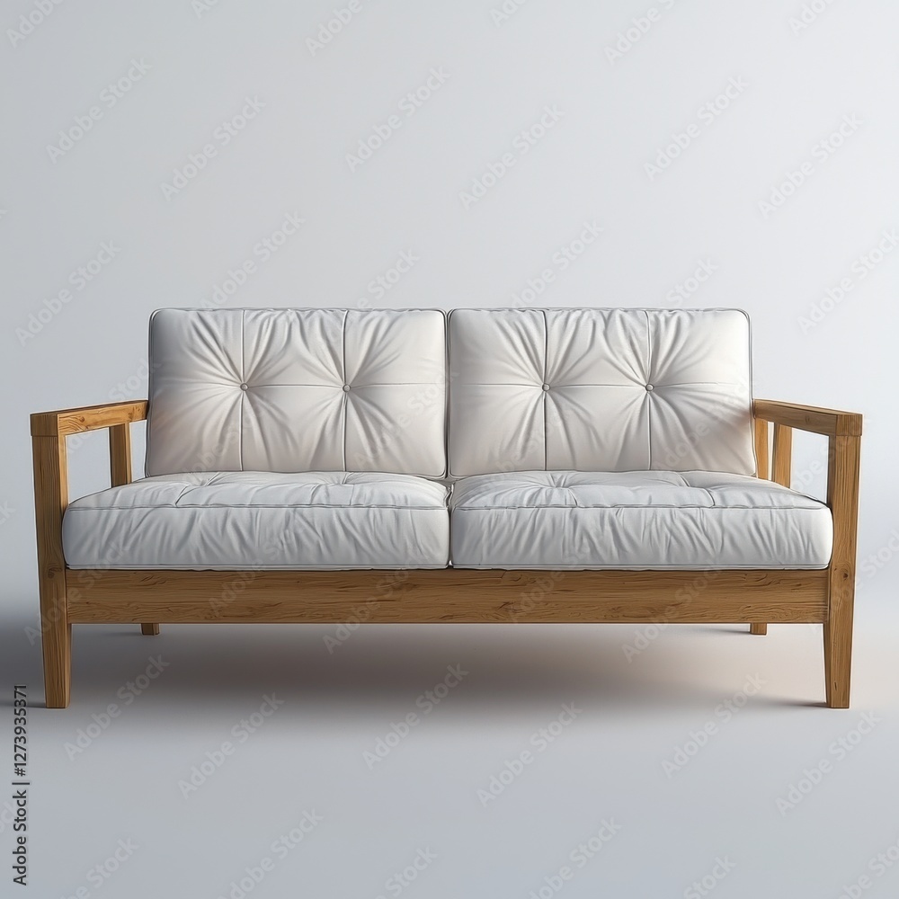 A stylish two-seater sofa with white cushions and a light wooden frame, perfect for a modern living space, showcasing clean lines and minimalist design aesthetic, studio shot. #1273935371