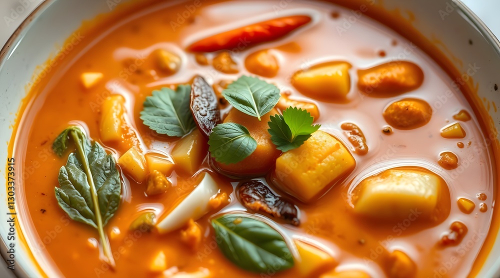 A vibrant bowl of creamy soup featuring fresh vegetables, aromatic herbs, and spices, creating a comforting and flavorful culinary experience ideal for any meal. #1303373915