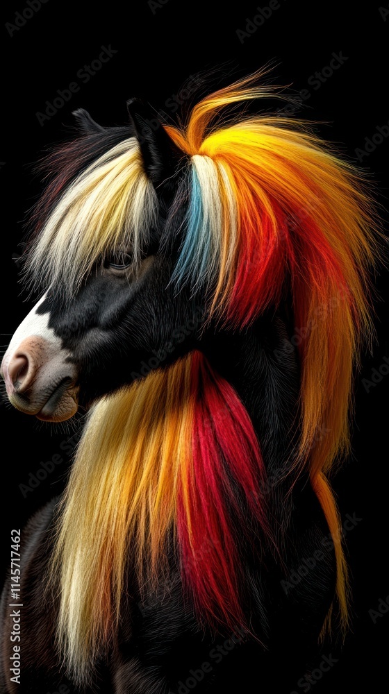 A vibrant horse with a multicolored mane against a dark background. #1145717462