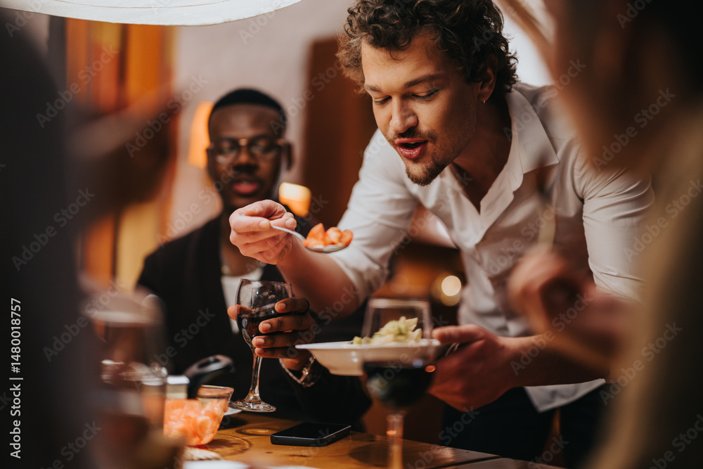 A warm and inviting scene of friends sharing food and drinks around a dining table. #1480018757