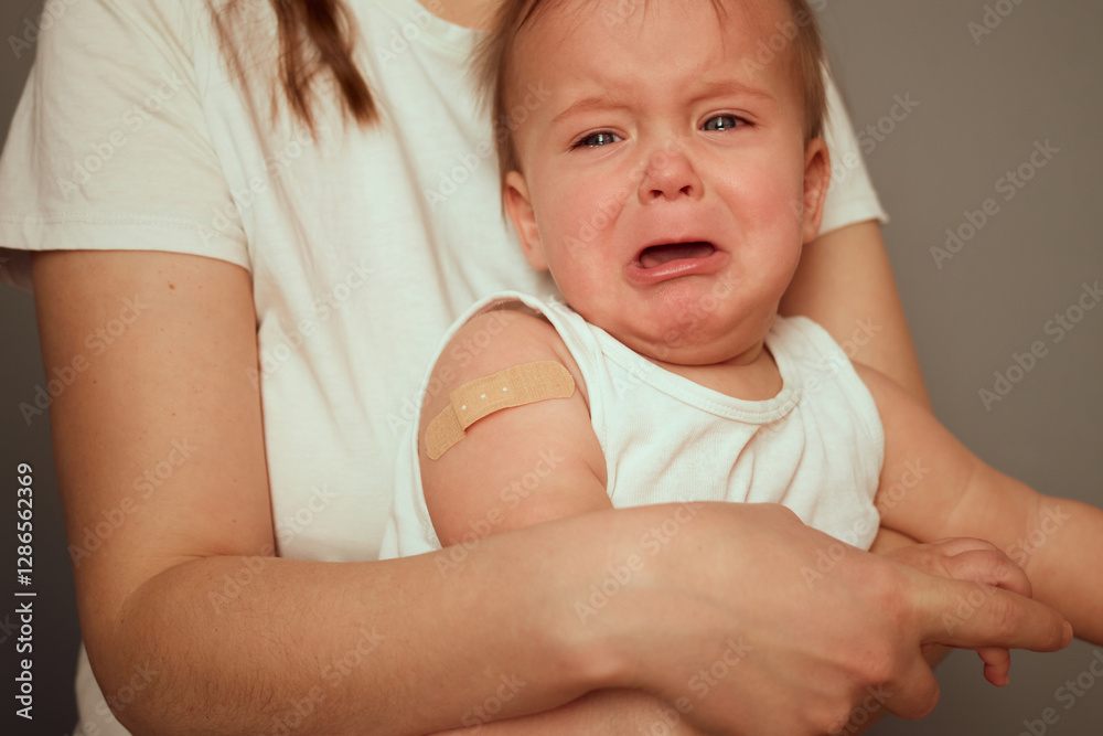 A young child in a white shirt is held by a parent after receiving a vaccination. The child shows signs of distress, indicating discomfort from the recent inoculation on the arm #1286562369