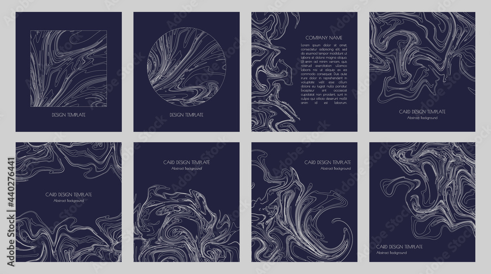 Abstract topographic contours and graphic thin white lines for modern minimalist business card template designs, presentations, invitations, fliers and covers. Set of Geometric Stylish Dark Backdrops. #440276441