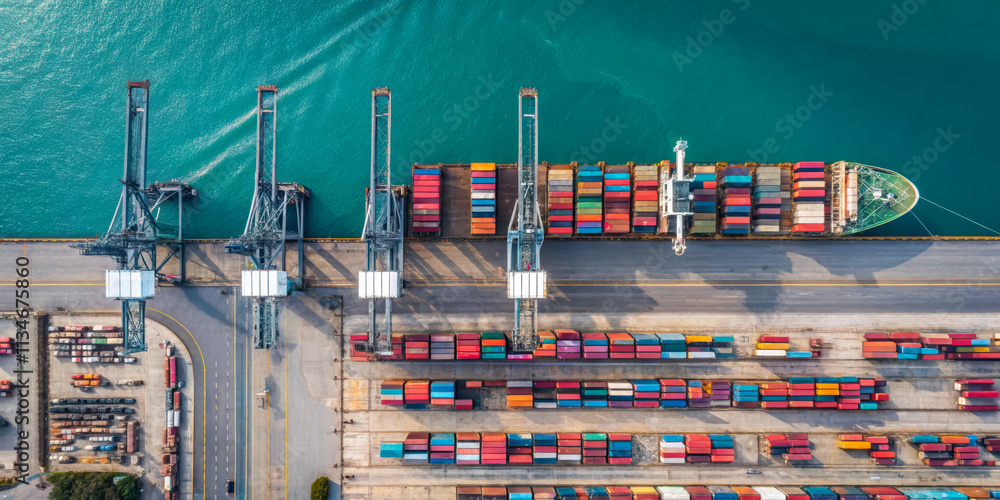 Aerial View of Cargo Ship Docked at Container Port with Cranes #1134675860