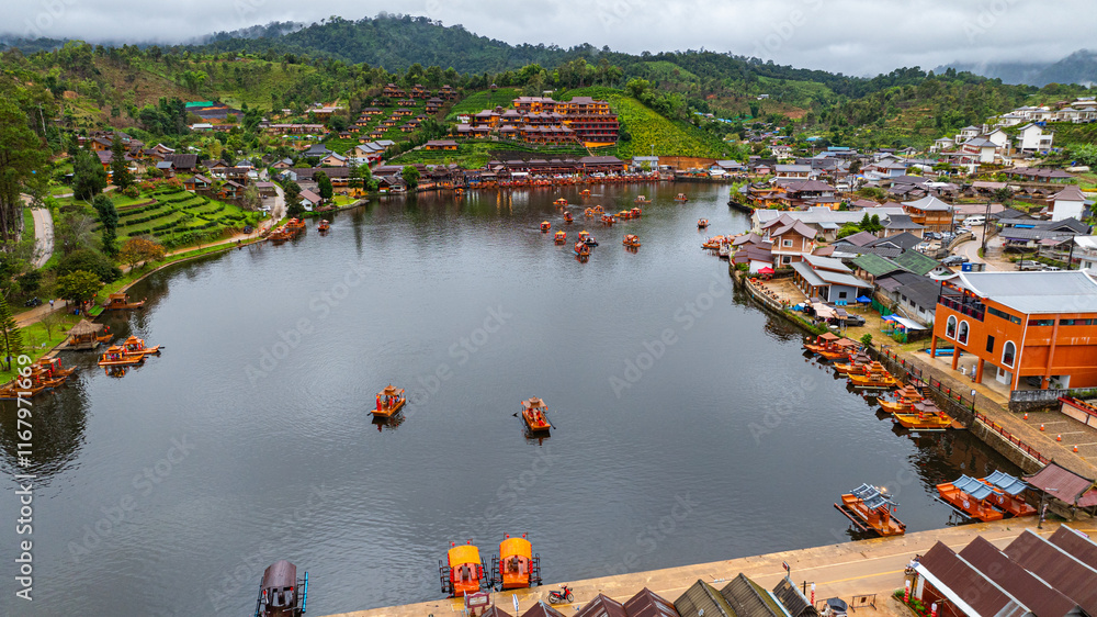 Aerial view of tranquil lakeside village nestled in lush, mist-covered hills under an overcast sky. The calm water reflects the vibrant buildings, raft creating a serene and picturesque scene.. #1167971669