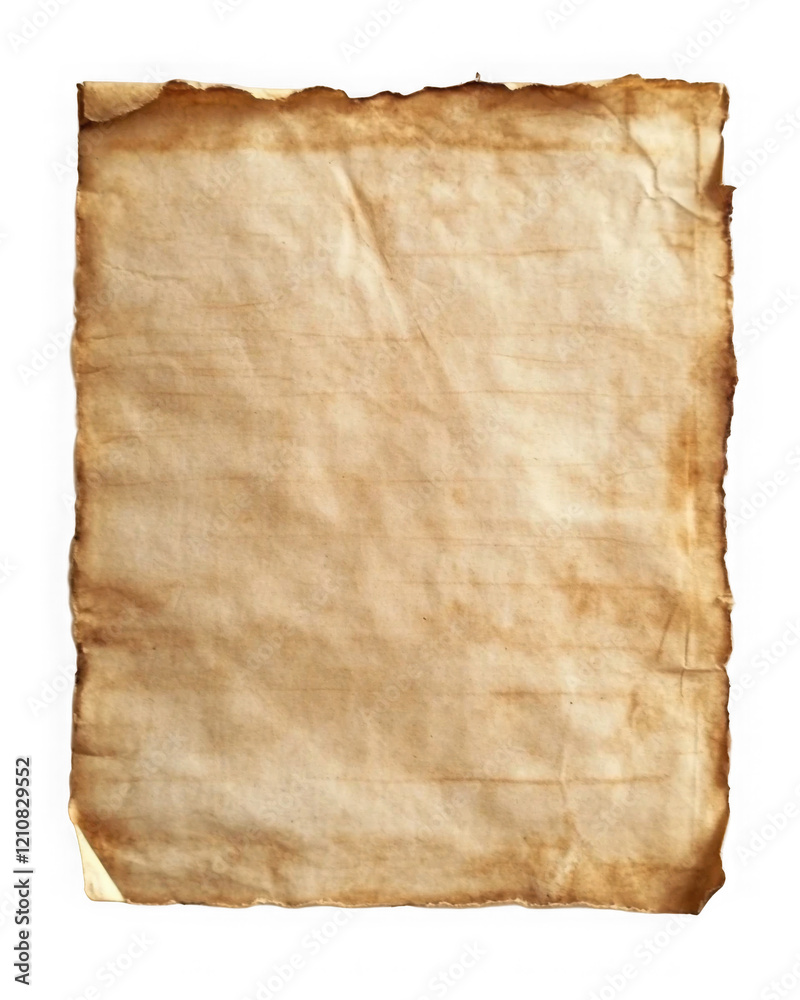 Aged parchment paper with rough, torn edges, showcasing a vintage and worn appearance. Ideal for antique-themed projects, crafts, or historical documents. Isolated on transparent background, png. #1210829552