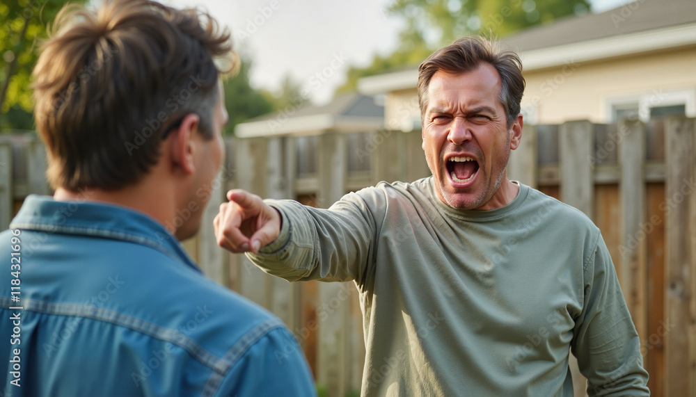 Angry neighbor Angry man yelling and pointing during backyard argument #1184321696