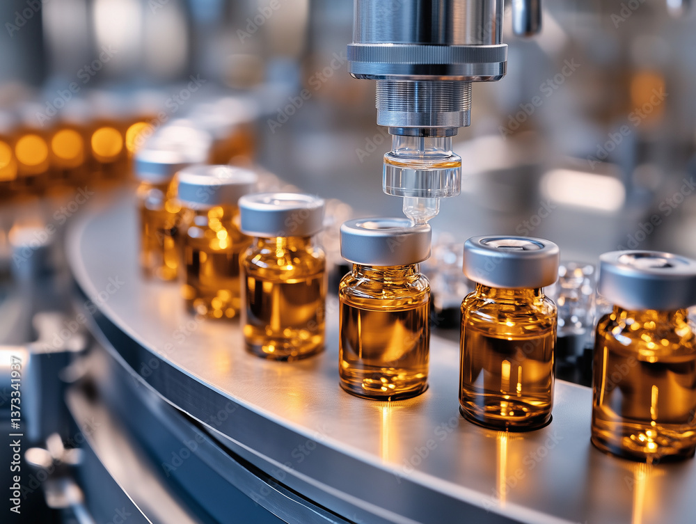 Automated filling process in compounding pharmacy with amber vials. scene captures precision of pharmaceutical manufacturing, showcasing importance of quality control #1373341937