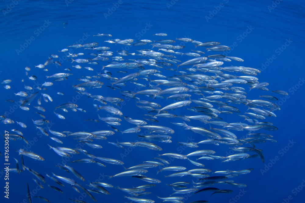 Ball of sardines near the surface.Small fish in huge shoal. Common fish in the ocean are looking for food. #876530637