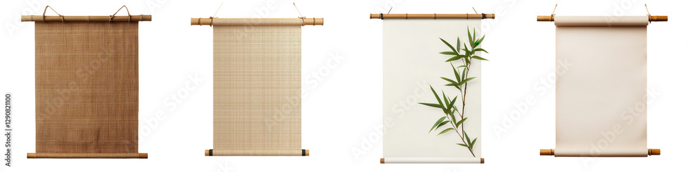 Blank bamboo scroll or roll mockup on a traditional antique oriental paper backdrop with copy space Vintage East Asian calligraphy or painting display template in minimalist natural #1290821100