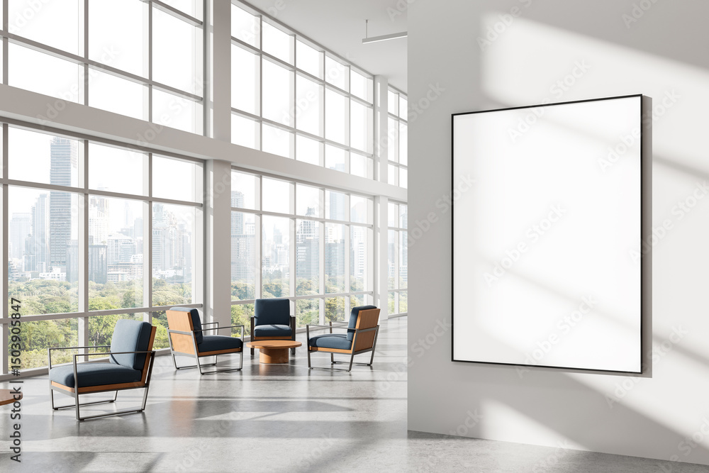 Blank poster mockup on clean white wall in bright modern office interior with large windows and cityscape view in background for advertising concept. 3D Rendering #1503905847