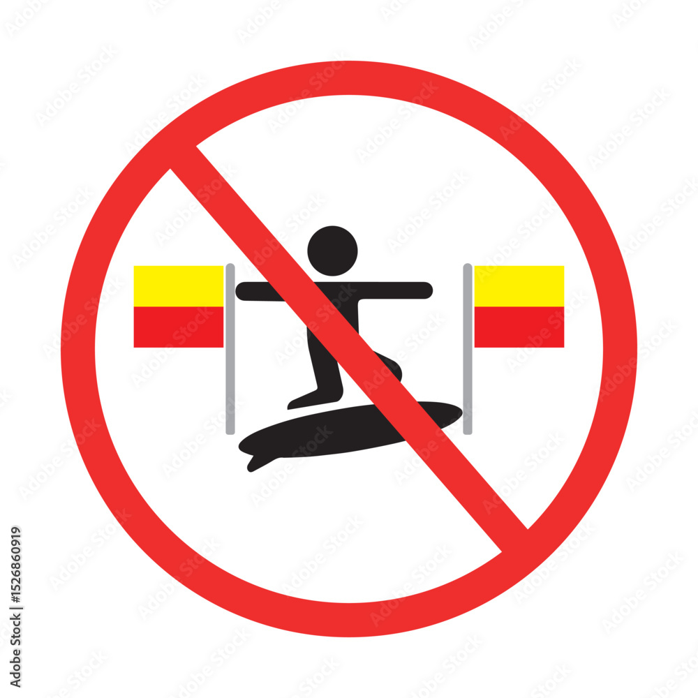 bold no surfing sign with red prohibition circle and black surfer icon between yellow red flags on white background #1526860919