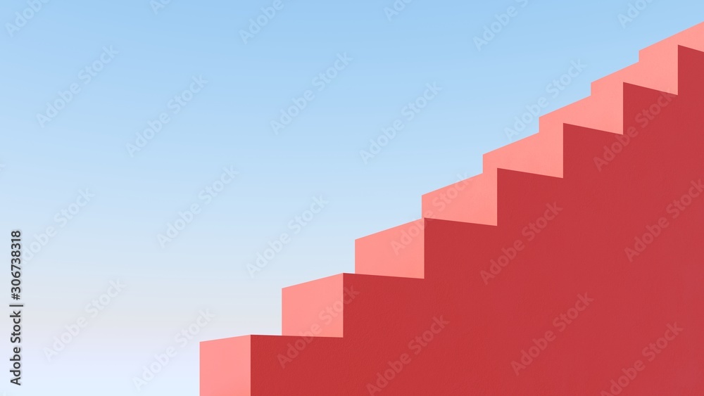 Bright design against the blue sky with tropical palm leaves - 3D, render.Architectural background of buildings with stairs and arches. Banner, poster, card for travel, presentations with copy space. #306738318
