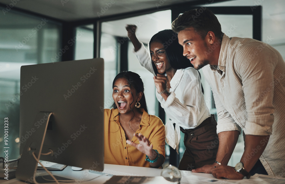 Business people, computer and celebration in office for feedback, collaboration or teamwork. Women, man and tech for cooperation in working late for project, corporate pitch or proposal with success #970013233