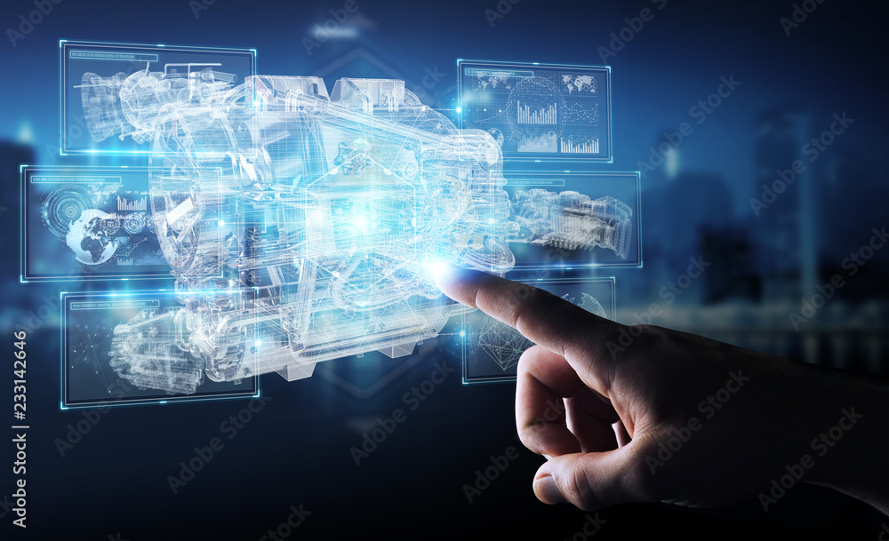 Businessman using wireframe holographic 3D digital projection of an engine #233142646