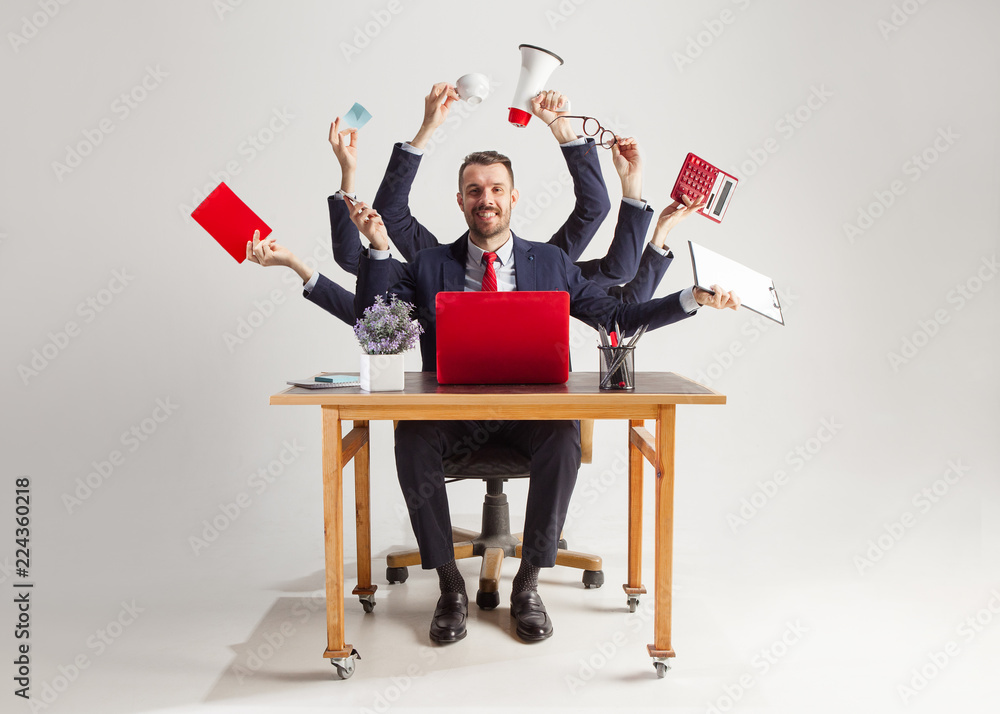 businessman with many hands in elegant suit working and holding office tools. Isolated over white background. Concept of busy #224360218