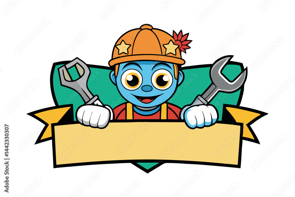 Cartoon labor union emblem with wrench, hammer, and hard hat symbols representing work and teamwork for Labor Day or Labour Day #1442330307
