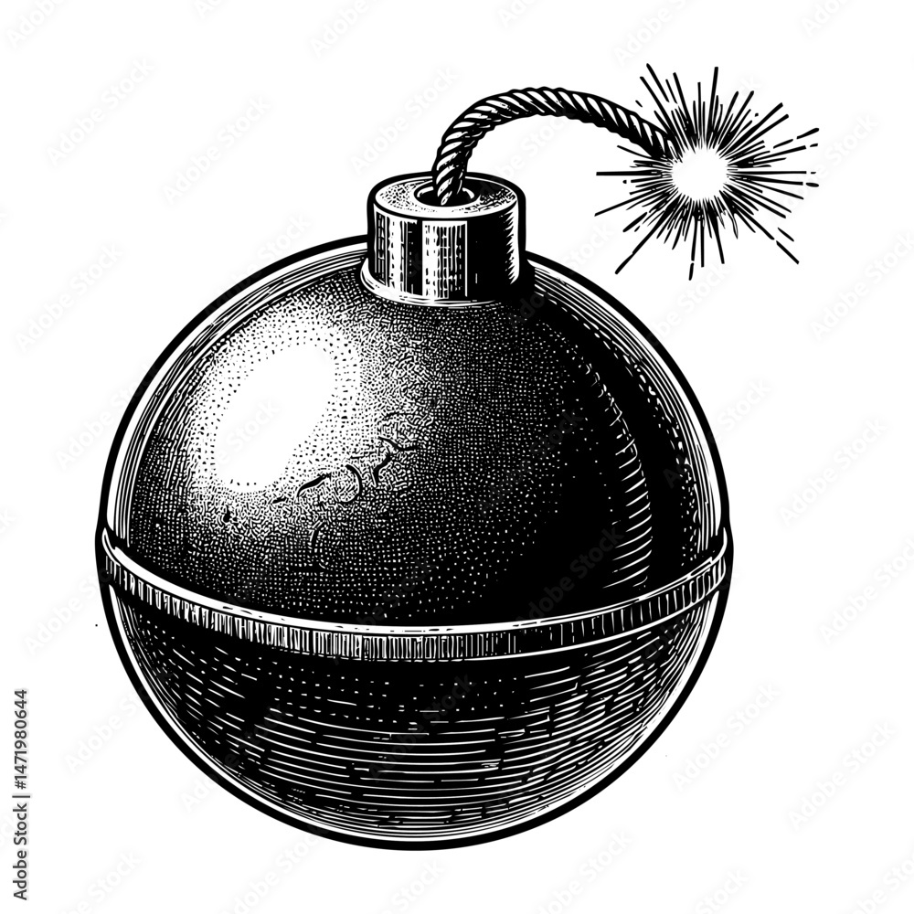 Classic round bomb with a lit fuse sketch engraving black and white outline. Scratch board imitation. illustrated in vintage line art style on a white background. #1471980644