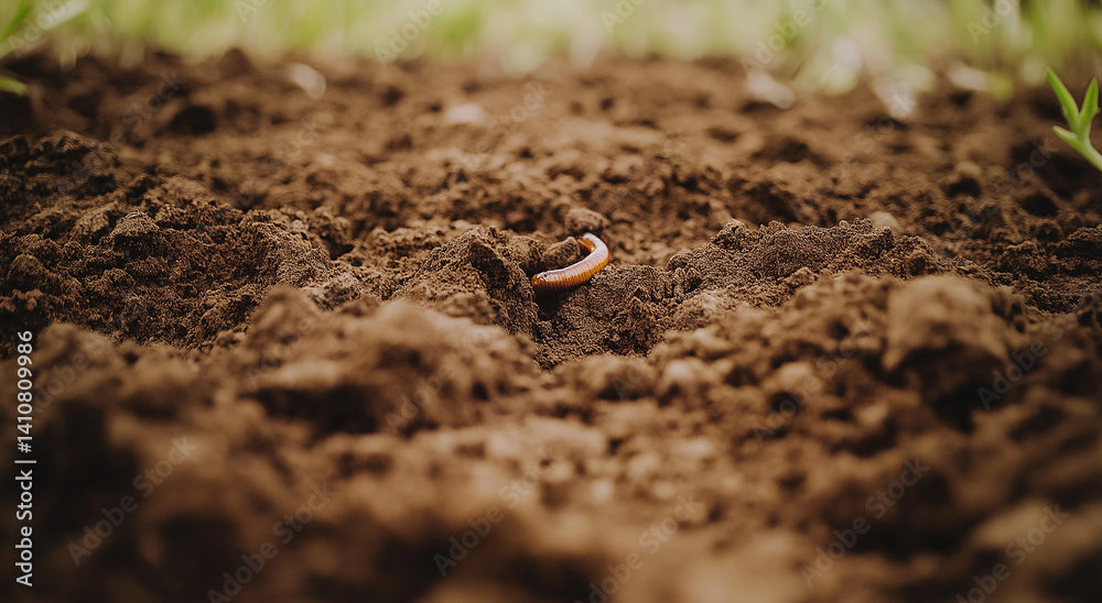 Close-up de solo rico com minhocas visíveis na superfície, mostrando um ecossistema #1410809986
