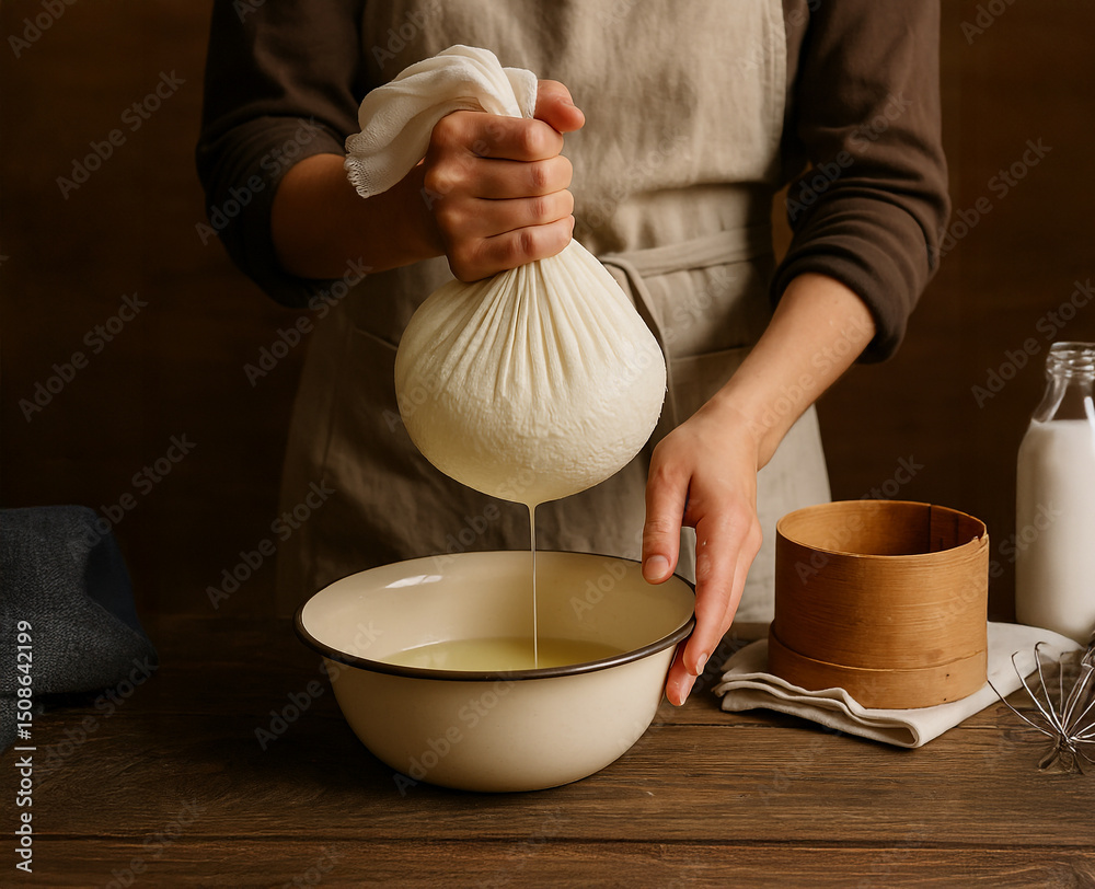 Close-up of a person straining fresh curd in cheesecloth, with whey dripping into an enamel bowl. Rustic home kitchen setting with natural lighting, milk bottle, and wooden cheese mold #1508642199