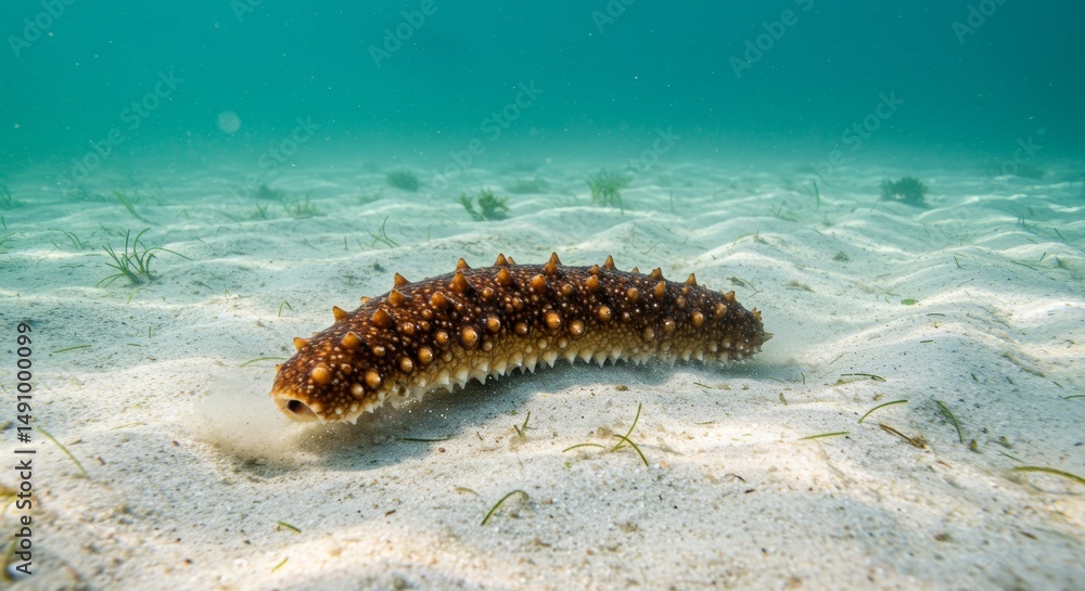 Close-up of a spiky sea cucumber resting on the sandy ocean floor #1491000099