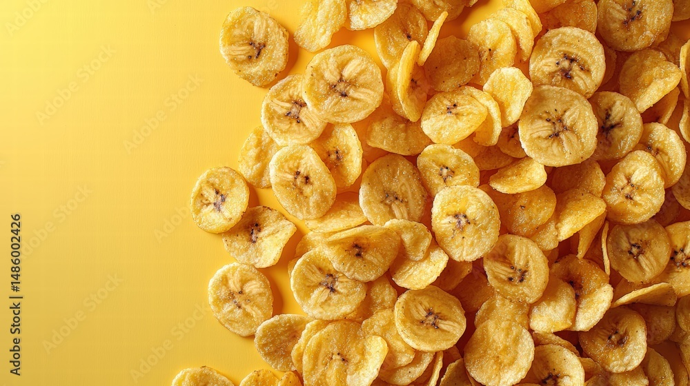 Close-up of dried banana chips arranged in a cluster on a yellow background showcasing crispy golden texture and natural sweetness for healthy snack imagery #1486002426