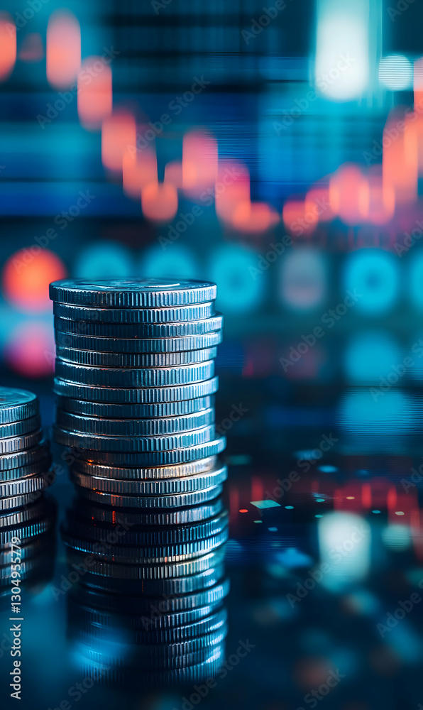 Close up stack of shiny silver coins in front of financial chart represents prosperity growth #1304955779