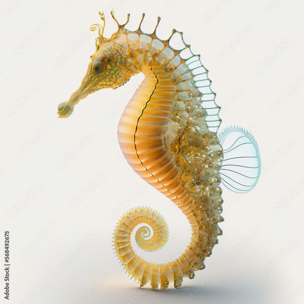 3D illustration of seahorse with gold color tones, realistic texture, isolated, rendered object #568492675