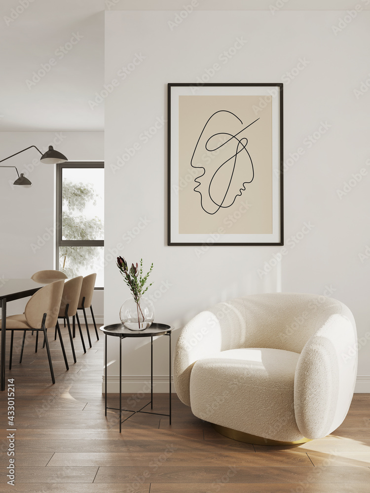 3d rendering of a minimal relaxed space with earthy tones and a beige sheepskin club armchair #433015214