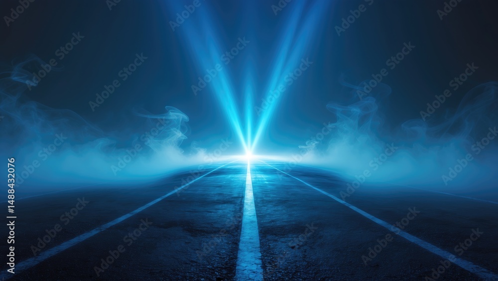 Desolate street scene with blue rays and smoke in the background #1488432076
