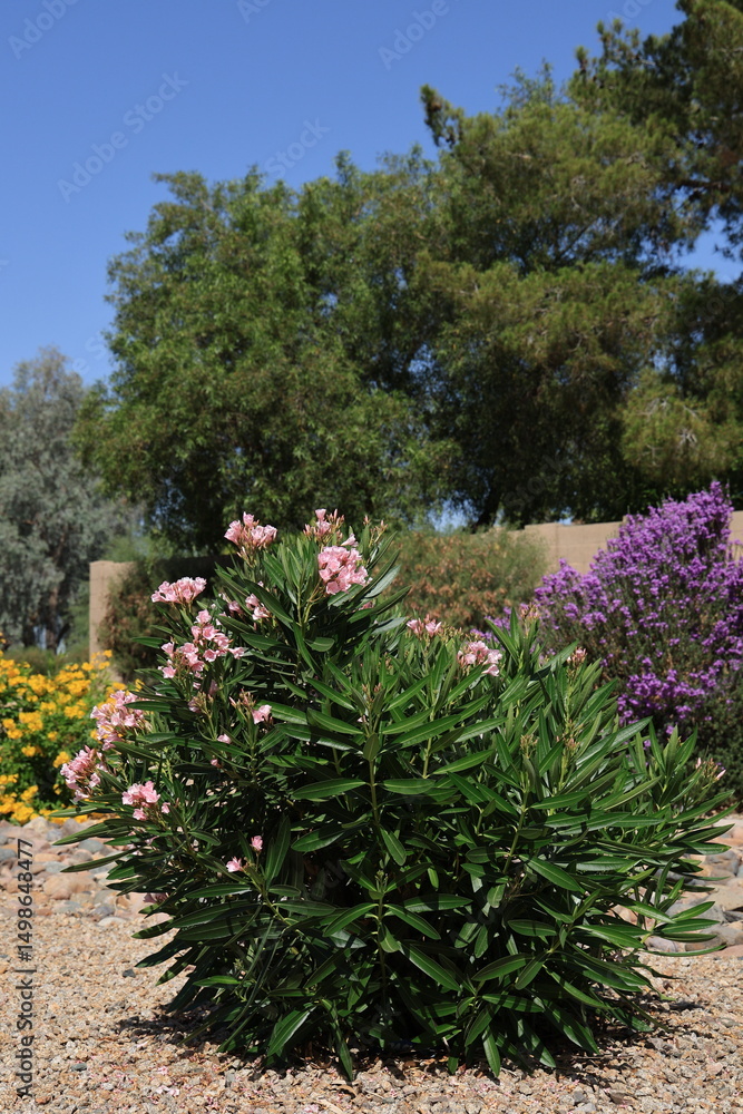 Drought tolerant pink Oleander shrub or Nerium Petite Oleander with gentle flowers along with blooming Texas Sage and Tecoma stans in xeriscaped grounds in Phoenix, Arizona #1498643477