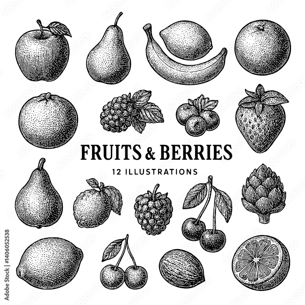 Engraved illustration of assorted fruits and berries on a transparent background featuring detailed designs and botanical accuracy #1406052538