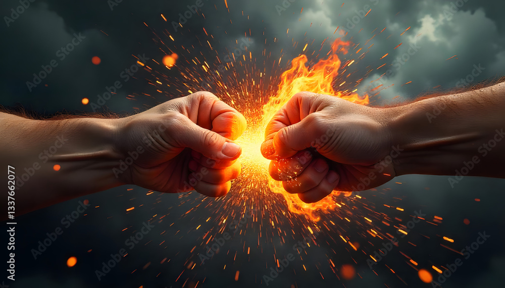 Fist bump, fire, explosion, power, energy, impact, strength, intensity, collision, sparks, flames, force, dynamic, action, clash, conflict, tension, drama, heat, explosion, power, intensity, collision #1337662077