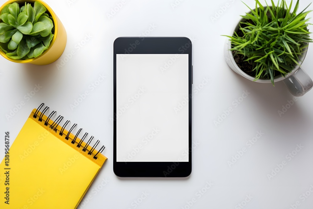 Flatlay Smartphone Mockup with Blank Screen, Yellow Notepad, and Plants #1389568736