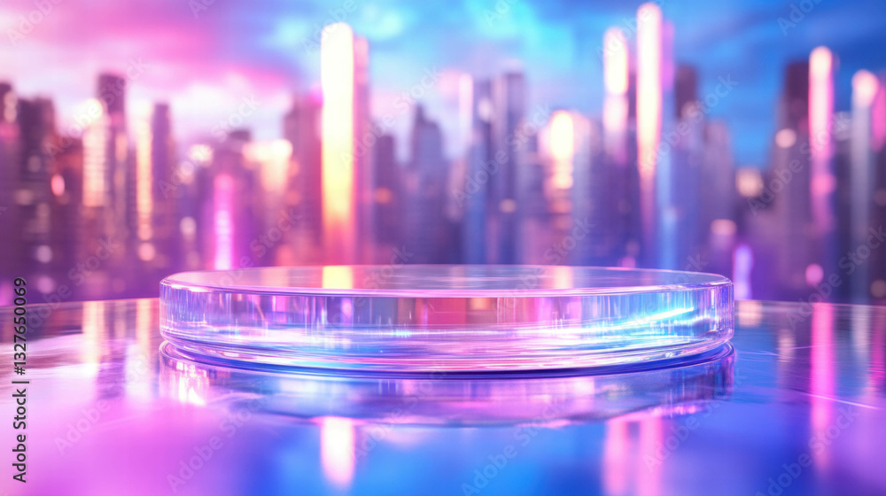 Futuristic urban skyline with glass podium in neon lights for display and design #1327650069