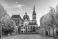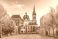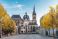 German cathedral in Aachen during fall with yellow leafs at trees with blue sky #217658929