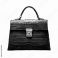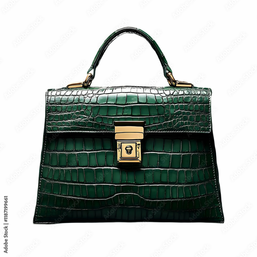 Green crocodile leather handbag with a gold lock, front view on a black background, captured in hyper-realistic detail, perfect for luxury product shots in high resolution. #1187199661