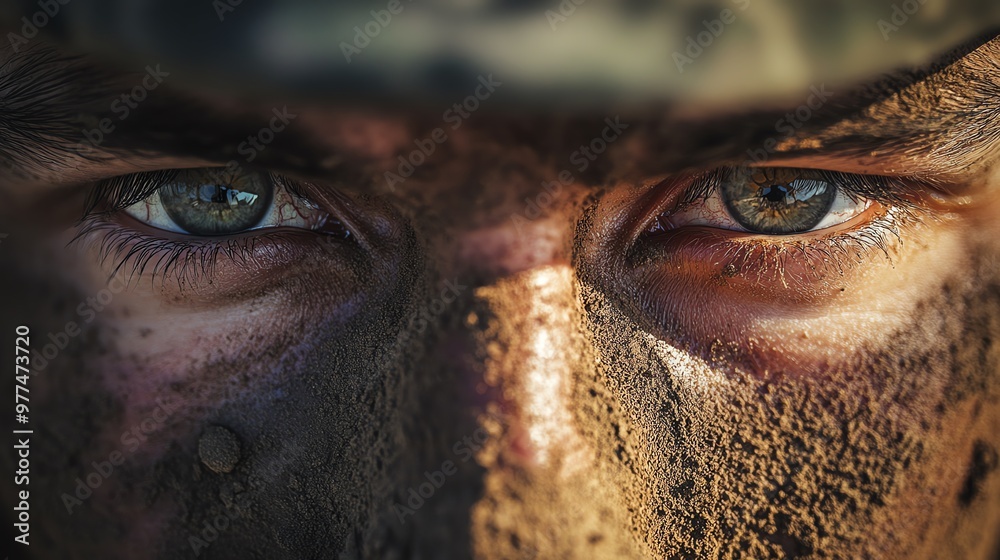 Gritty, determined eyes of a soldier covered in dust, Determined soldier, Focus and resilience #977473720