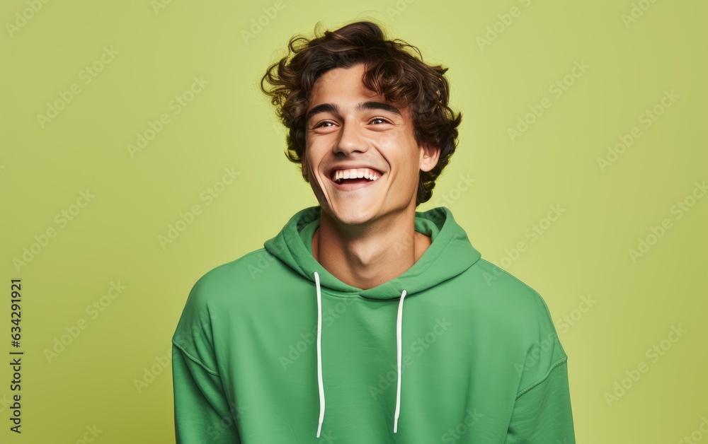 Happy ultra young handsome man, who is smiling and laughing, wearing bright clothes. Bright solid green background. created by generative AI technology. #634291921