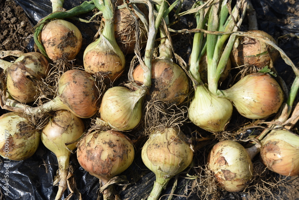 Harvesting onions in the vegetable garden. Onions can be harvested six months after planting. Harvest on a sunny day, cut the roots, dry in the field for 2-3 days, and hang in the shade for storage. #503001727
