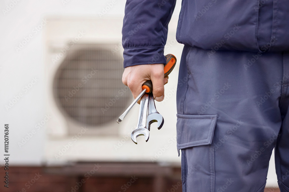 Heat Pump Install Service. Worker Hand with Tools Installing Heat Pump System or Conditioner. #1112076361
